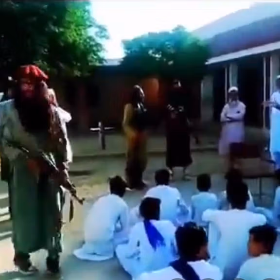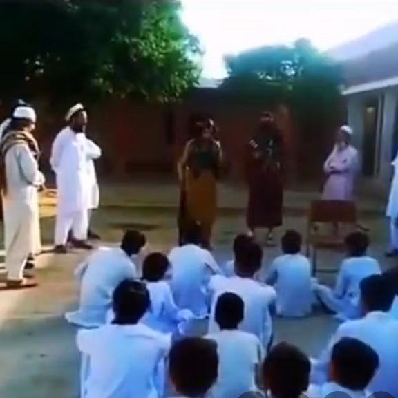 زدهکوونکي او ښوونکي ټول د وسله والو د ډلمشر خبرو ته غوږ دي. هغه ورته وايي، چې له دې وروسته په «شیوا تحصیل کې» دولتي ښوونځیو ته تګ بند دی.