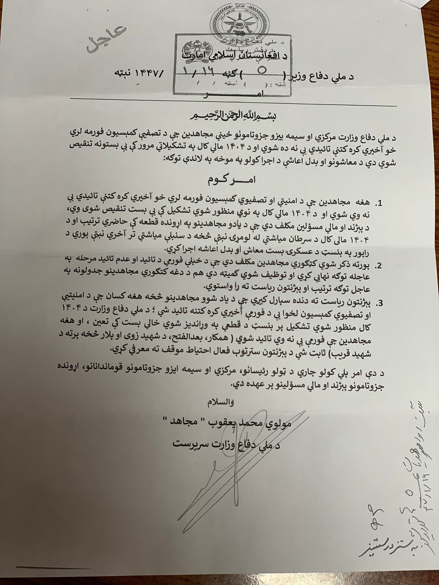 په داسې حال کې، چې د ملي دفاع وزارت ګڼ پخواني افسران له معاش پرته رخصت شوي، د طالبانو د دفاع وزیر ملا یعقوب مجاهد په یوه مکتوب کې د وزارت له پېژند او مالي مسوولینو غوښتي، چې د تصفیې فورمې لرونکو تنقیص شويو طالبانو ته معاشونه او بدل اعاشه ورکړي.