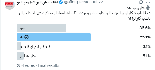 په ورته وخت کې پر اېکس په ورته سروې کې ۲۵۴ کسانو برخه اخیستې، چې ۵۵،۱ سلنه کسان وايي، کار نه لري، خو ۳۶،۶ سلنه نورو ویلي، چې کار لري. دغه راز ۳،۱ سلنه کسانو ویلي چې کلهناکله کار لري او ۵،۱ سلنه نورو ویلي، چې نظر نه لري.