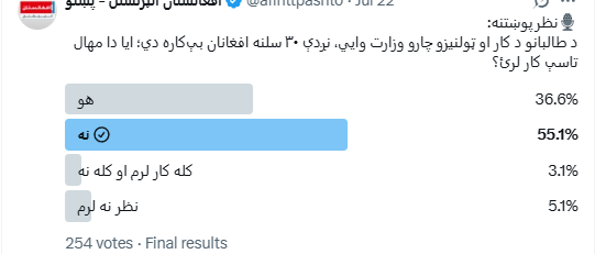 د افغانستان انټرنشنل پښتو پر ټویټر او فیسبوک د نارسمي سروې د شمیرو د کچې له مخې، ټولیزه پایله ښيي چې شاوخوا ۵۲،۱ سلنه ګډونوال بېکاره دي. دا نتیجه د طالبانو د ۳۰سلنه بېکارۍ له رسمي ادعا شاوخوا ۲۲سلنه لوړه ده.