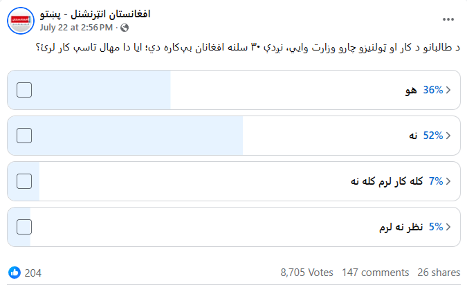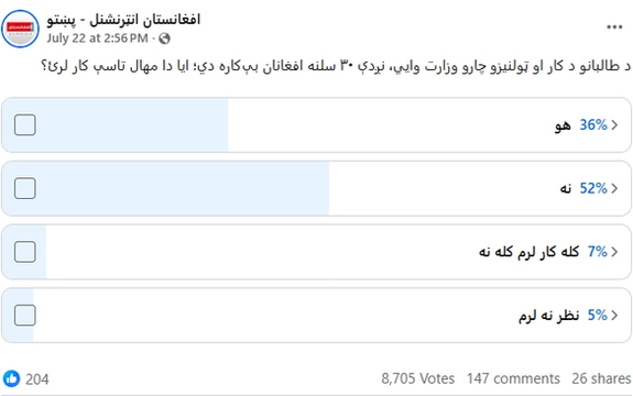 د افغانستان انټرنشنل پښتو په فېسبوک کې خپره شوې سروې، چې ۸،۷۰۵ کسانو پکې برخه اخیستې، ښيي چې۵۲ سلنه بې کاره، ۳۶سلنه کارلرونکي، ۷ سلنه کله ناکله کارلرونکي دي او ۵ سلنه نورو کسانو ویلي، چې په دې اړه نظر نه لري.