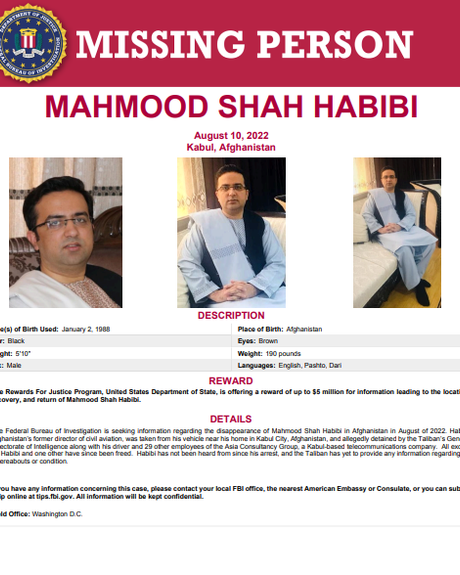 د امریکا د پلټنو فدرالي ادارې (ایف بي ای) د افغانستان د ملکي هوايي چلند د پخواني رییس محمودشاه حبیبي د لادرکه کېدو پوسټر خپور کړی او د نوموړي د موندلو په اړه د څیړنو او خپلې کورنۍ ته د هغه د سپارلو ژمنتیا یې ښودلې ده.