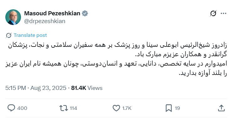پزشکیان په خپل اېکس کې لیکلي: «د شېخالرییس ابوعلي سینا د زوکړې او د ډاکټر ورځ دې ټولو د روغتیا او ژغورنې سفیرانو، درنو ډاکټرانو او زمونږ قدرمنو همکارانو ته مبارک وي. هیله لرم چې د تخصص، پوهې، ژمنتیا او انسان دوستۍ په سیوري کې لکه تل د ګران ایران نوم نور هم لوړ او روښانه وساتئ.»