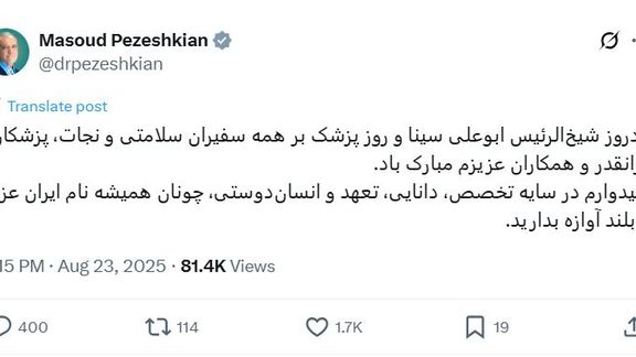 پزشکیان په خپل اېکس کې لیکلي: «د شېخالرییس ابوعلي سینا د زوکړې او د ډاکټر ورځ دې ټولو د روغتیا او ژغورنې سفیرانو، درنو ډاکټرانو او زمونږ قدرمنو همکارانو ته مبارک وي. هیله لرم چې د تخصص، پوهې، ژمنتیا او انسان دوستۍ په سیوري کې لکه تل د ګران ایران نوم نور هم لوړ او روښانه وساتئ.»