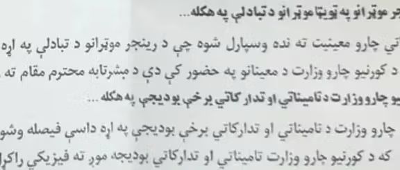 دمکتوب کې په پای کې لیکل شوي چې د کورنیو چارو وزارت د تامیناتي چارو معینیت ته دنده سپارل شوې، څو په دې اړه د مشرتابه عالي مقام ته وړاندیزونه تیار کړي. همداراز ویل شوي، کله چې د رینجر موټرو د تبادلې راپور د منظورۍ لپاره مشرتابه ته وړاندې کېږي، نو پورته یاد شوي وړاندیزونه دې هم ورسره یوځای شي.