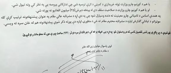 په دې مکتوب کې لیکل شوي، چې د طالبانو کورنیو چارو وزارت د صلاحیت سقف دې له پنځه دېرش میلیونه افغانۍ نه پورته کیږي.