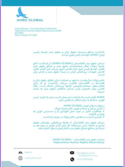 د افغانستان د بشري حقونو څارونکی بنسټ وایي، څو ورځې کېږي چې ایراني پولیسو د افغان مېرمنو او بشري حقونو فعاله حلیمه پژواک نیولې ده. دغه بنسټ د اغلې پژواک نیول کېدل غندلی او دا یې له بشري حقونو څخه ښکاره سرغړونه بللې ده.