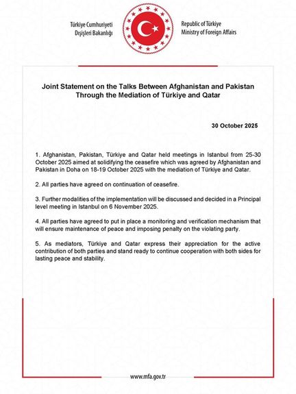 د طالبانو او پاکستان د خبرو د پایلې په ګډه اعلامیه کې راغلي، چې د اوربند د پلي کېدو نور جزیات به د همدې کال د نومبر په ۶مه په استانبول کې د دواړو لوریو د مشرانو په کچه غونډه کې وڅېړل شي او پرېکړه به پرې وشي.