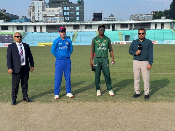 د افغانستان او بنګلهدېش ترمنځ لوبه؛ افغان لوبډله لومړی توپ وهنه کوي
