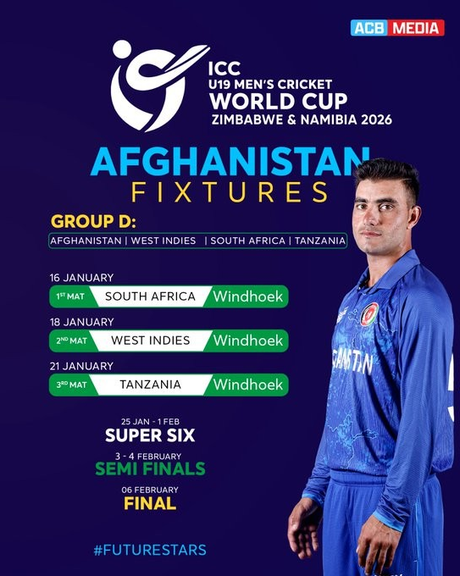 د افغانستان کرېکټ بورډ د ۲۰۲۶کال د ۱۹ کلنو نړۍوال جام لوبو مهالوېش اعلان کړ. د دغه مهالوېش له مخې؛ د افغان لوبډلې لومړۍ لوبه د راتلونکي ۲۰۲۶کال د جنورۍ په ۱۶مه نېټه د سویلي افریقا لوبډلې پر وړاندې ده.