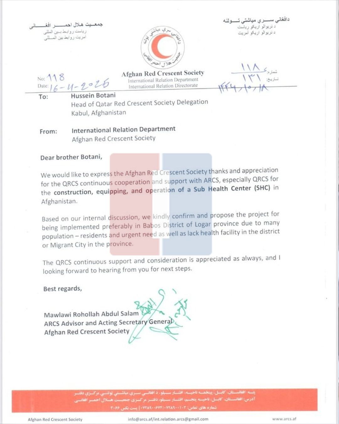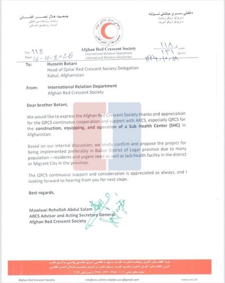 په دې مکتوب کې غوښتنه شوې ده، چې د قطر سرې میاشتې ټولنې په مالي لکښت یو روغتیايي مرکز ودانۍ د جوړېدو پلان او د هغه ټول تجهیزات دې د لوګر ولایت مرکز پل عالم د نوموړي خپل پلارني کلي بابوس ته انتقال شي.