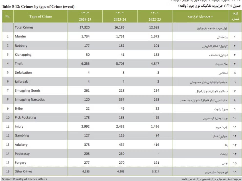 دا ارقام، چې د طالبانو د کورنیو چارو وزارت د معلوماتو پر بنسټ د احصایې او معلوماتو ادارې په کلنۍ کتابچه کې د ۲۰۲۵ کال د نومبر په پای کې خپرې شوې، ښيي چې جنايي جرمونه، په ځانګړي ډول قتل او غلا، په تېرو درېیو کلونو کې پام وړ زیات شوي دي.
