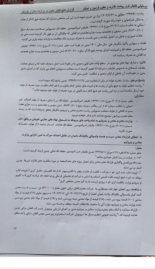 یادې ادارې د طالبانو د مشر د ۱۸ ⁄ ۵ ⁄ ۱۴۰۳نېټې حکم او د ریاست د۶۹۰۰۶۸۷/۳۹ شمېرې صلاحیتلیک له مخې له ۱۴۰۱ کال نه تر ۱۴۰۳ کال پورې ددې ډلې د کانونو او پترولیم وزارت د مسوولینو د درغلیو موضوع څیړلې ده.