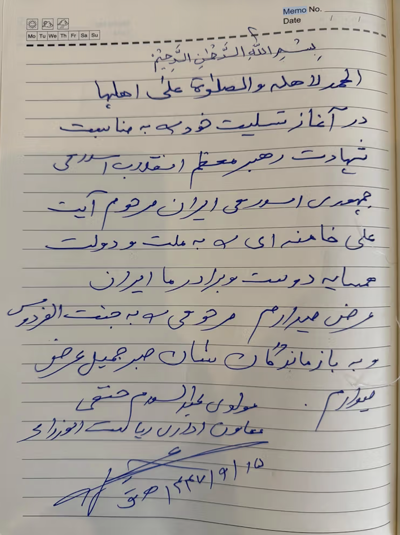 په کابل کې د ایران سفارت د چهارشنبې په ورځ د خپل مشر علي خامنهیي د مړینې له امله د غمرازۍ د لاسلیک رسمي مراسم ترسره کړل. په دې مراسمو کې د طالبانو د ریاستالوزرا اداري مرستیال عبدالسلام حنفي ګډون کړی و، چې د هغه په لاس لیکل شوی فارسي متن په رسنیو کې خپور شوی دی.
