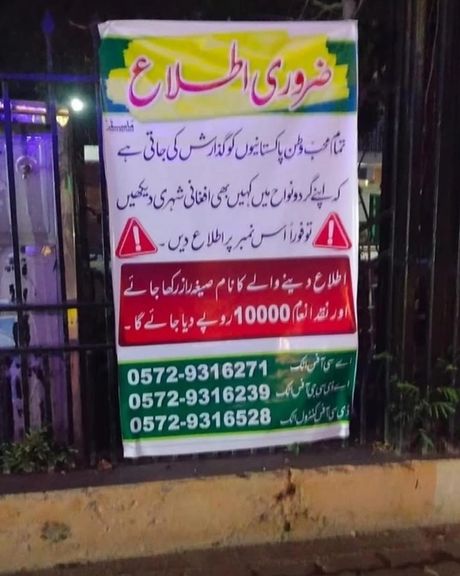 د اټک په بېلابېلو سیمو کې پولیسو داسې بنرونه لګولي چې د افغان کډوالو د نیولو لپاره د معلوماتو په بدل کې د ۱۰زره کلدارو د انعام ورکولو ژمنه پکې شوې ده. دا اقدام داسې مهال کېږي چې په پاکستان کې د افغان کډوالو د نیولو او ایستلو لړۍ په وروستیو میاشتو کې چټکه شوې ده.