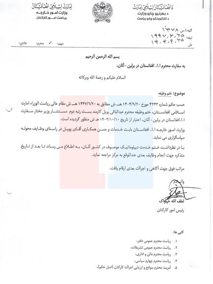 د طالبانو د بهرنیو چارو وزارت د مکتوب له مخې د وزارت د کارکونکو د چارو رییس لطف الله خپلواک پر لاسلیک دوه میاشتې وړاندې په جرمنی کې د افغانستان سفارت ته په یوه مکتوب کې د سفارت د سرپرست عبدالباقي پوپل دنده د ۱۴۰۴ کال د مرغومي پر ۱۰مه پای ته رسولې وه او غوښتنه ورڅخه شوې وه، چې کابل ته مراجعه وکړي.