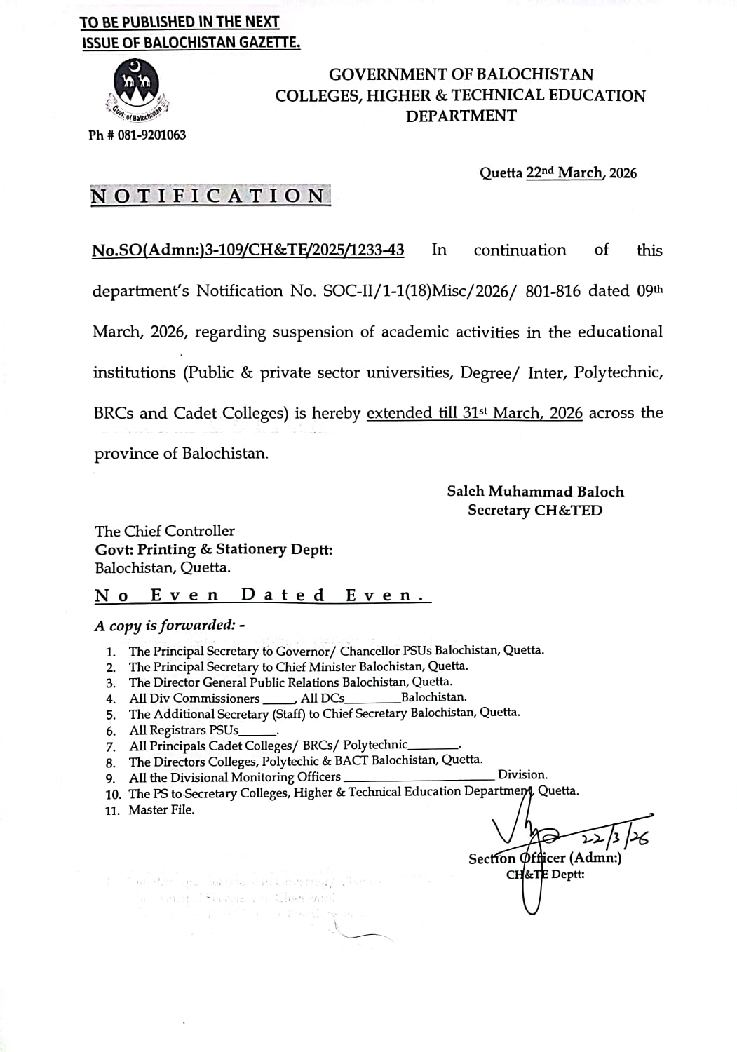 د ځايي مسوولینو په وینا، په بلوچستان کې تعلیمي ادارې د روانې مارچ میاشتې له نهمې راهیسې د ایران، امریکا او اسراییل تر منځ له شخړې او همداراز په پاکستان کې د نفتو د کموالي او د بیو د لوړوالي له امله ځنډول شوې دي.