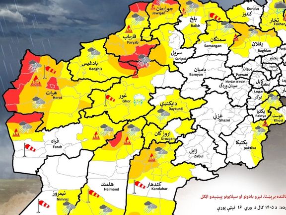 د طالبانو د هوا پوهنې ادارې د شنبې په ورځ خبر ورکړی، چې نن او سبا په ۲۴ ولایتونو کې د تیز باران، واورې، تالندې برېښنا، تیزو بادونو او سیلابونو راوتو اټکل شوی.
